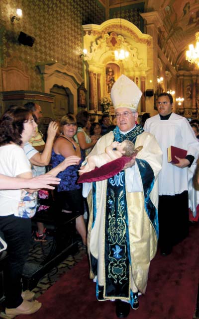D. Tarcísio Scaramussa, bispo diocesano de Santos, com a imagem do menino Jesus trazida da Palestina: bispo entronizou a imagem na 22ª Exposição de Presépios Internacionais, no Santuário Santo Antônio do Valongo, no Centro Histórico de Santos, aberta à visitação pública até 28 de fevereiro, das 8 às 18 horas, reunindo em 47 nichos peças de artistas brasileiros, da Itália, Alemanha, Israel, França, Coréia do Sul, Turquia, Colômbia… Viva o Natal, Feliz 2016!